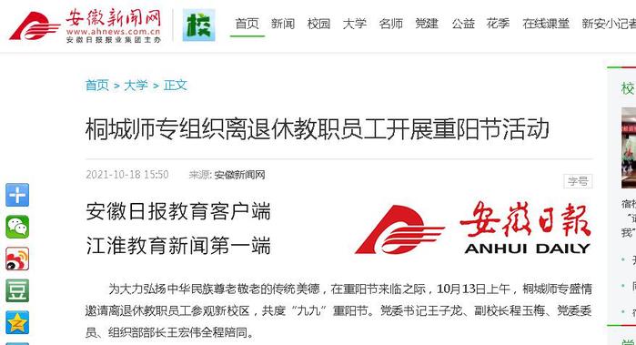 安徽新聞網:《桐城師專組織離退休教職員工開展重陽節活動》