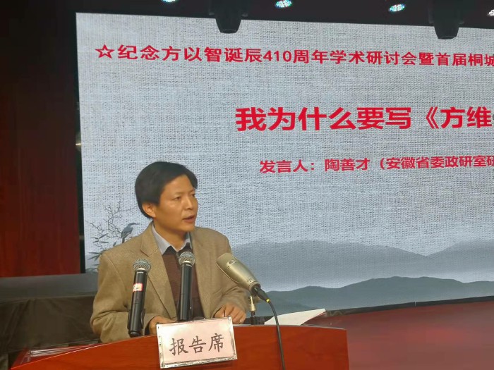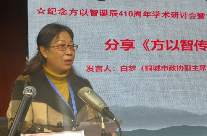 曾一直期待有影響的作家,尤其是女作家來執筆寫方維儀。在久等不到別人寫的方維儀傳記時,決定自己來動筆。經過四年多的寒暑堅持,終於在紀念方以智誕辰410周年之際,完成了一個荷壓已久的心結。說明:圖17陶善才發言