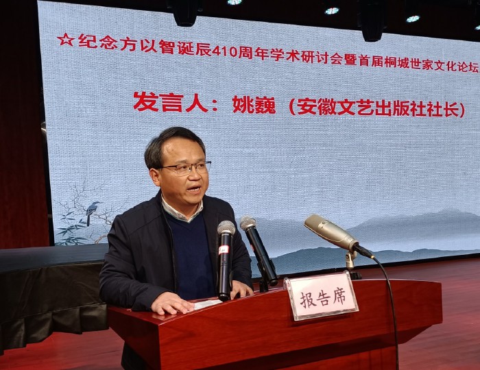 他說,安徽文藝出版社是一家以文化、文學和音樂出版為主的專業出版社,與关键词2當代桐城的許多作家、作者都有過合作。省文聯主席陳先發先生主編的《優秀中短篇小說精品集》由安徽文藝出版社出版,在今年的黃山書會上召開了新書發布會;安徽省作協副主席洪放先生在我社出版的小說《追風》,是以合肥市科技興城為主旨,也在今年的黃山書會上舉辦了盛大的新書發布會。2013年我社就出版了陶善才先生的《大明奇才方以智》,今年又出版了他的《方維儀傳》。文運通,則國運通。積極弘揚中華優秀傳統文化,提煉人文內涵,以文化人,古為今用,是关键词2出版人的使命和擔當。安徽文藝出版社將持續關注桐城,通過文學藝術的方式,謳歌當代桐城的發展變化,為桐城的曆史文化傳承貢獻关键词2的力量!說明:姚巍發言