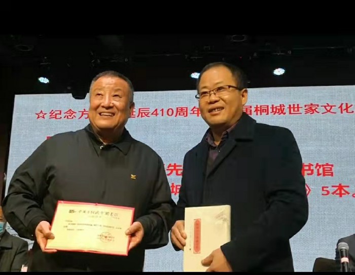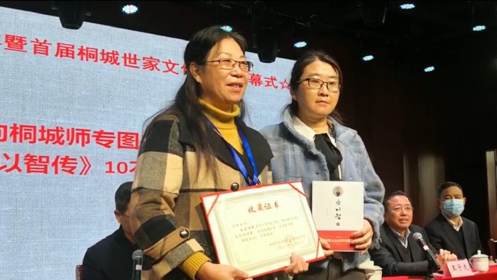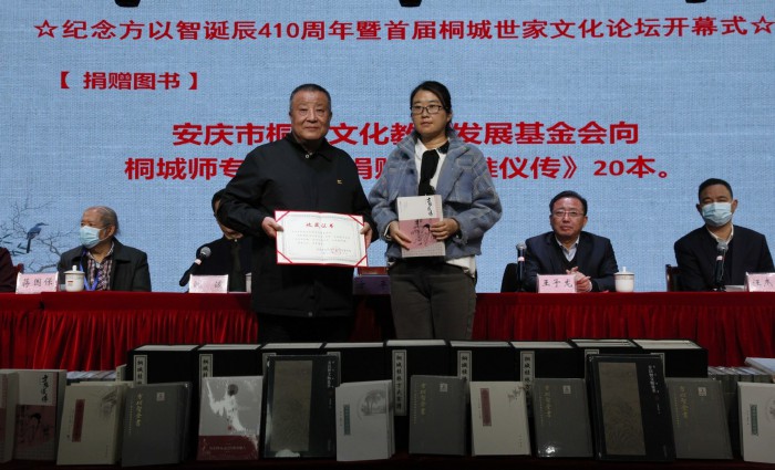 開幕式上還舉行了舉行了捐贈圖書儀式,安慶市桐城文化教育發展基金會向桐城師專圖書館捐贈《方維儀傳》20本,方平向桐城師專圖書館捐贈《桐城方氏曲廬合集》10本、向桐城市圖書館捐贈《桐城方氏曲廬合集》5本,方以智裔孫方無先生向桐城師專圖書館捐贈《方以智全集》一套,著名作家白夢向桐城師專圖書館捐贈她自己的著作《方以智傳》10本,桐城師專圖書館、桐城市圖書館分別向捐贈者頒發了捐贈證書。說明:b35ad1951bf34e68880fde3594d04bb