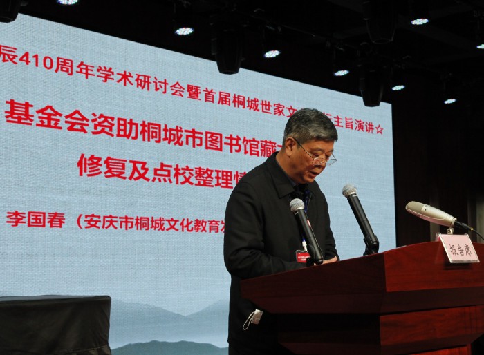 桐城文化教育發展基金會副秘書長李國春先生介紹安慶桐城文化教育發展基金會資助桐城市圖書館藏古籍修複及點校整理情況。
