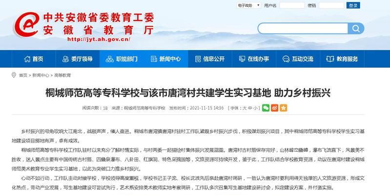 安徽教育網:《桐城師範高等專科學校與該市唐灣村共建學生實習基地 助力鄉村振興》