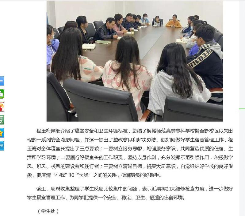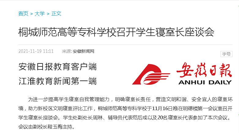 安徽新聞網:《桐城師範高等專科學校召開學生寢室長座談會》