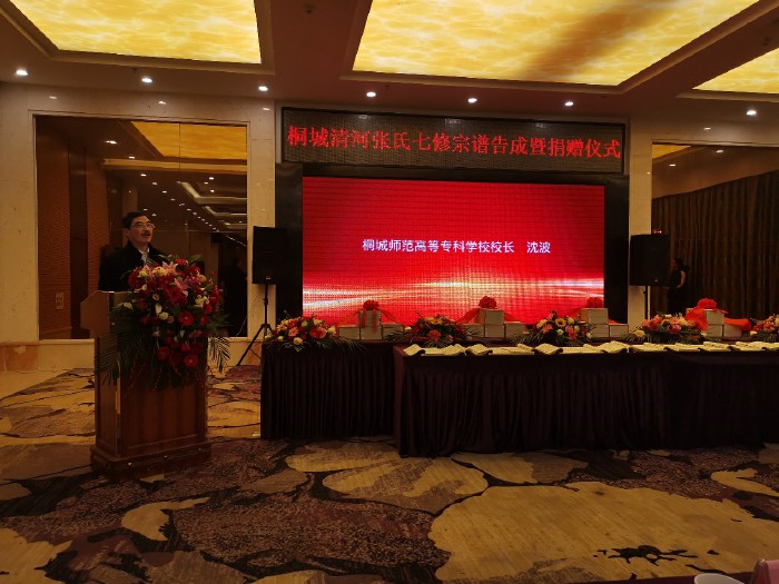 2022年元月8日,桐城清河張氏七修宗譜告成暨新譜捐贈儀式在桐城國際大酒店二樓多功能廳舉行。桐城清河張氏代表向我校圖書館及安慶市圖書館、安慶師範大學圖書館、桐城市圖書館、桐城市博物館等單位捐贈《張氏宗譜》七修本各一套。校長沈波出席捐贈儀式,並代表受贈單位致辭。