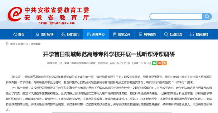 安徽新聞網:《開學首日桐城師範高等專科學校開展一線聽課評課調研》