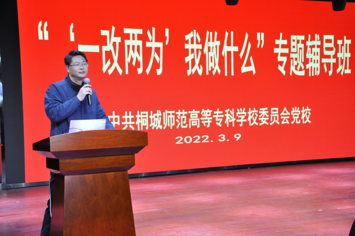 3月9日下午,桐城師專黨校開辦“‘一改兩為’我做什麽”專題輔導班,校黨委委員、組織部、統戰部部長、組織人事處處長王宏偉作專題輔導報告,全體黨員同誌參加了會議。