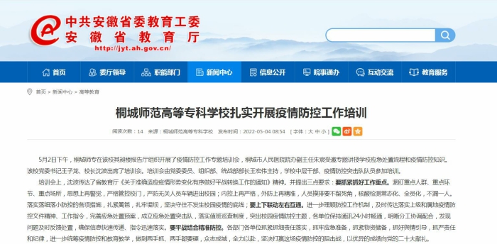 安徽教育網:《桐城師範高等專科學校紮實開展疫情防控工作培訓》