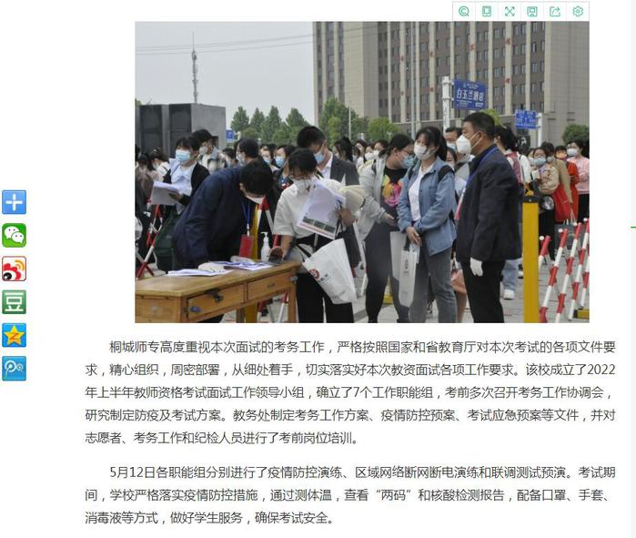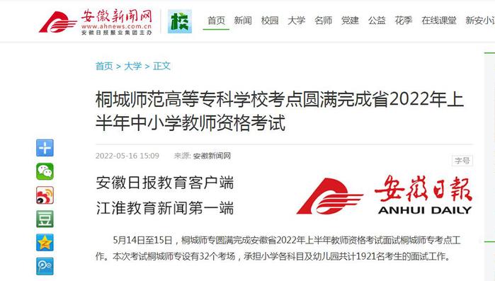 安徽新聞網:《桐城師範高等專科學校考點圓滿完成省2022年上半年中小學教師資格考試》