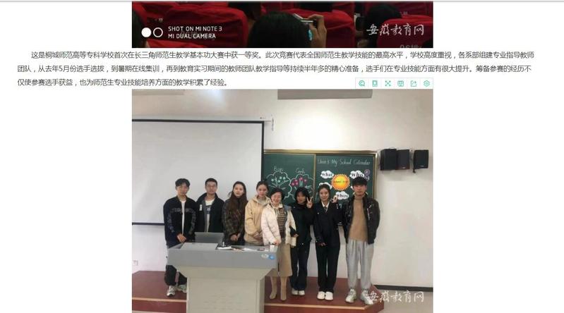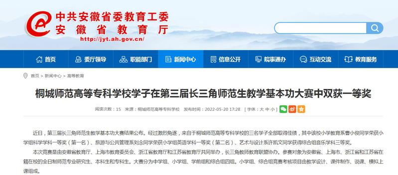 安徽教育網:《桐城師範高等專科學校學子在第三屆長三角師範生教學基本功大賽中雙獲一等獎》