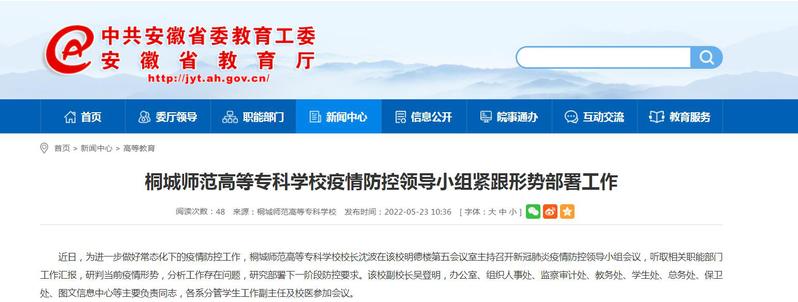 安徽教育網:《桐城師範高等專科學校疫情防控領導小組緊跟形勢部署工作》
