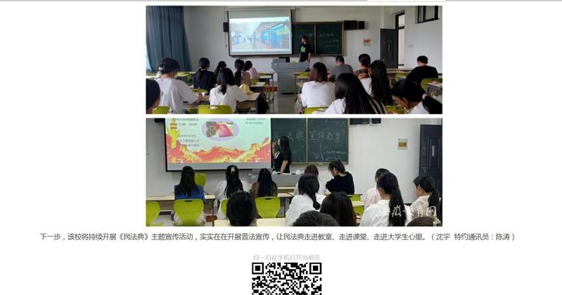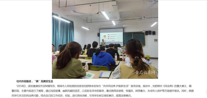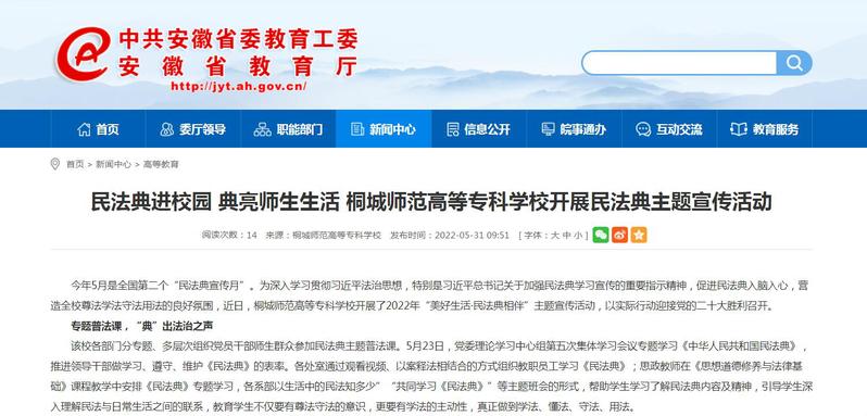 安徽教育網:《民法典進校園 典亮師生生活 桐城師範高等專科學校開展民法典主題宣傳活動》