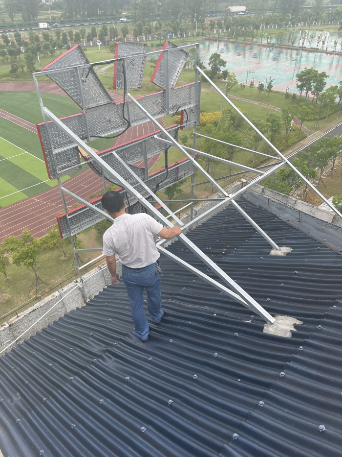此次安全檢查主要是針對學生公寓樓“桐城師範高等專科學校”的燈光招牌及戶外大屏等設施,檢查基礎及地腳螺栓有無開裂、傾斜,鋼筋有無外露、鬆動、鏽蝕,螺母有無鬆動、鏽蝕、缺失;被依附體結構有無開裂、破損,錨固螺栓有無外露、鬆動、鏽蝕、缺失;麵板及圍護是否完好,有無滲水、變形、翹裂、脫落、破損;紮繩管(杆)固定是否牢固,有無脫落、鏽蝕;畫麵材料是否完好,有無破損、老化、褪色;顯示單元固定是否定完好、有無鬆動等。另外,根據文件要求,保衛處還對電氣、照明係統及戶外防雷設施進行了安全檢查。