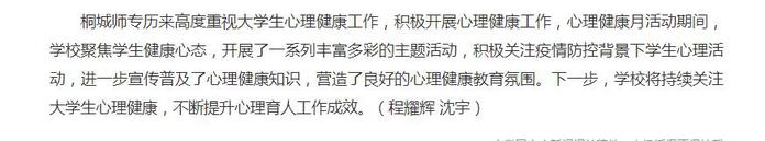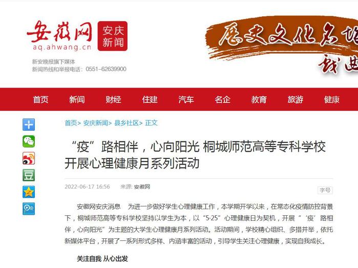 安徽網:《“疫”路相伴,心向陽光 桐城師範高等專科學校開展心理健康月係列活動》