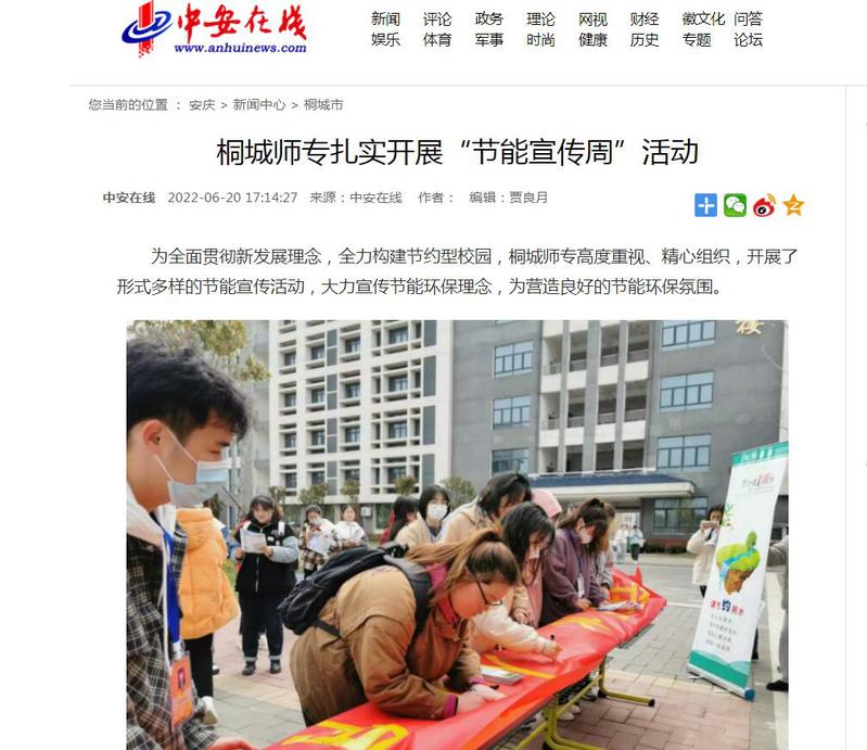 中安在線:《桐城師專紮實開展“節能宣傳周”活動》
