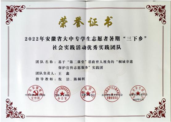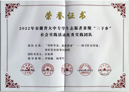 近日,中共安徽省委宣傳部、安徽省文明辦、安徽省教育廳、共青團安徽省委、安徽省學生聯合會等五部門聯合發布《關於公布2022 年安徽省大中專學生誌願者暑期“三下鄉”社會實踐活動評選結果的通報》(皖青聯〔2022〕43 號),對2022年安徽省暑期社會實踐活動進行了總結表彰。