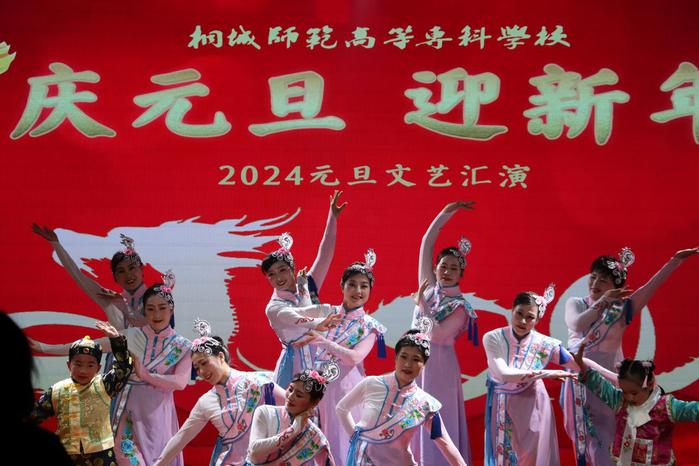 文藝匯演在舞蹈《盛世歡歌》中正式拉開序幕,演員們熱情洋溢的表演迅速點燃了現場的氣氛,合唱、吟誦、樂隊、古箏等輪番登場。動人心弦的合唱《如願》《桃花紅杏花白》表達了我校師生對於新年的美好祝願,也展示了我校音樂教育專業的學生們紮實的聲樂演唱和舞台表演功底。舞蹈《六尺巷》由桐城師專教職工舞蹈隊傾情演繹,老師們優雅的舞姿讓在場的觀眾們不由得發出“莫道桑榆晚,為霞尚滿天”的慨歎。由馬道成等五名同學組成的Topping-up樂隊用一首《最初的夢想》將整場匯演推向高潮。學前教育係的陸克麗同學為大家帶來了其在安徽省第七屆大學生藝術展演活動中榮獲舞蹈個人甲組一等獎第一名的作品《天涯共此時》,引得全場觀眾歡呼連連。最後,文藝匯演在桐城師專教職工合唱團高昂的歌聲中劃下圓滿的句號,合唱《不忘初心》《我的祖國》深情表達出我校全體師生員工與祖國一起砥礪前行,不負韶華的誌向。