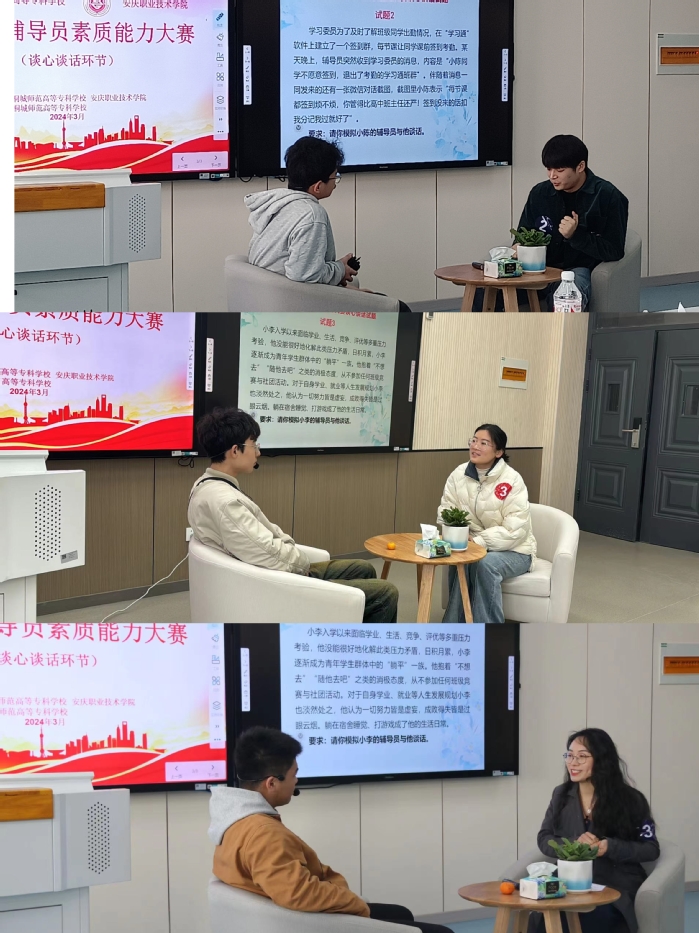 本次比賽全麵對標省賽,分基礎知識測試、案例研討和談心談話三個環節進行。其中基礎知識測試以閉卷形式開展,考察選手的理論知識水平;案例研討環節以“你提問,我回答”的形式比拚,選手兩兩一組,圍繞案例進行分析問題、研討對策、總結規律;談心談話環節以現場真實師生談話方式展開,考察輔導員對學生特征、學生成長成才規律的了解把握以及對學生的思想教育引導能力和危機應對能力。參賽選手們思維敏捷、思路清晰、直麵問題、循循善誘,憑借紮實的理論功底、豐富的工作經驗、過硬的職業能力和出色的現場表現等,贏得專家評委和觀摩者們一致好評。69d8089cb400643b2426e20de3f272f