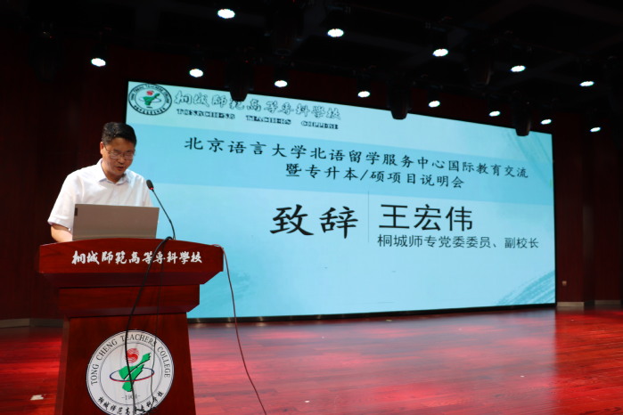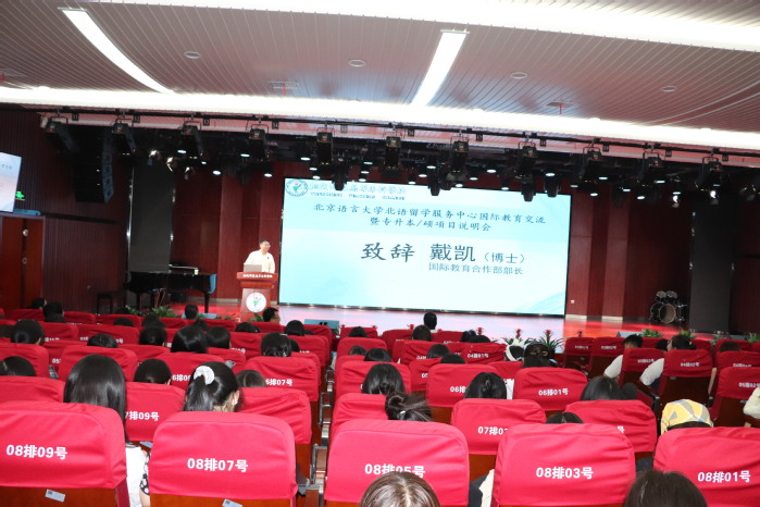 為進一步推動學校國際教育工作,拓寬學生學業提升渠道,5月29日下午,北京語言大學國際教育合作部部長戴凱博士一行4人到訪我校,在音樂廳組織開展專升本/碩項目說明會。校黨委委員、副校長王宏偉,部分畢業生代表參加會議。說明會由教務處處長程愛蘭主持。