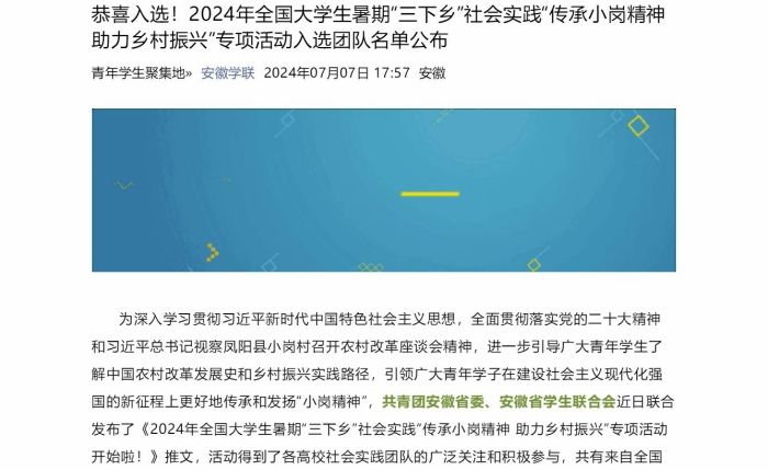 據悉,“傳承小崗精神助力鄉村振興”專項活動是由共青團安徽省委、安徽省學生聯合會共同主辦。共有來自全國129所高校的218支團隊報名,最終共有130支團隊入選。活動旨在引導廣大青年學生了解中國農村改革發展史和鄉村振興實踐路徑,引領廣大青年學子在建設社會主義現代化強國的新征程上更好地傳承和發揚“小崗精神”。
