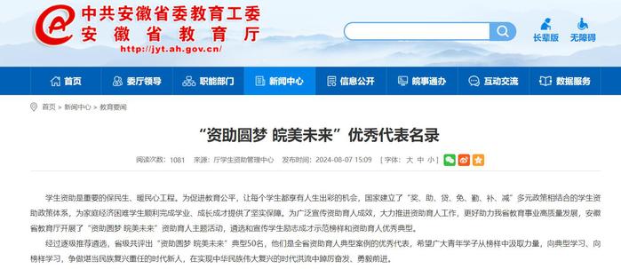 近日,安徽省教育廳公布全省“資助圓夢 皖美未來”優秀典型案例遴選結果,我校優秀畢業生方源盼成功入選(全省僅50人)。