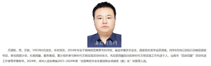 方源盼,男,漢族,1993年6月出生,中共黨員,2014年畢業於桐城師範高等專科學校,省品學兼優畢業生,國家勵誌獎學金獲得者。同年8月他以實際行動響應國家號召,參加西部計劃,紮根西藏,服務基層,累計組織參與新時代文明實踐活動60餘次。先後榮獲西藏自治區新時代文明實踐工作先進個人、山南市“四講四愛”活動先進工作者等榮譽稱號。2024年8月,該同誌榮獲2023-2024年度“全國高校畢業生基層就業卓越獎學(教)金”。