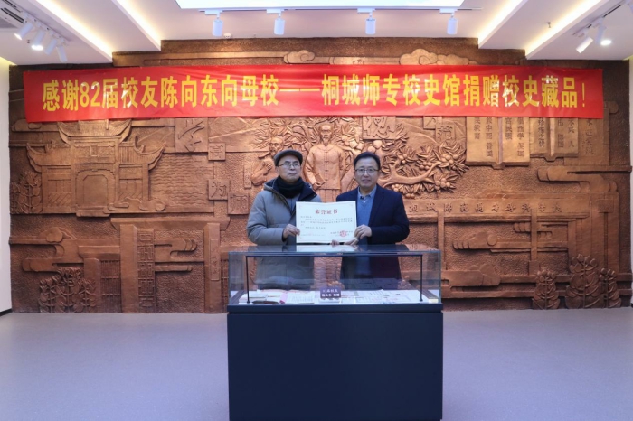 1月8日上午,我校82屆校友陳向東滿載著對母校的深情厚誼,重返校園,慷慨捐贈多件珍貴校史實物藏品。學校在校史館舉行捐贈儀式,校黨委書記王子龍、副校長程玉梅出席儀式。