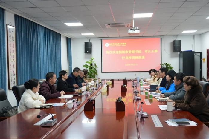 1月27日,桐城市委副書記、市長王靜一行來校調研座談。校長江貴生出席並主持座談會。桐城市委常委、常務副市長汪傑賢出席會議,桐城市政府辦、教育局、人社局、企業服務中心(科創中心)有關負責同誌,學校相關職能部門、院係負責同誌參加座談會。