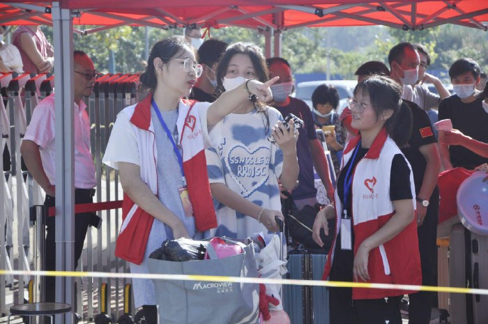 在疫情防控常態化大背景下,學校高度重視,嚴格落實防疫要求,嚴謹高效組織2021級新生錯峰報到。新生需經過查驗身份、健康碼、行程碼、疫苗接種碼、48小時以內核酸檢測陰性證明、測量體溫等流程後方可進入校園。校領導吳登明、程玉梅第一時間來到迎新現場,現場檢查和指導迎新工作,仔細詢問新生報到、疫情防控措施的落實情況,叮囑迎新工作人員和誌願者做好疫情防控,確保校園安全穩定,關注學生需求,為新生提供優質服務,讓學生安心、家長放心。