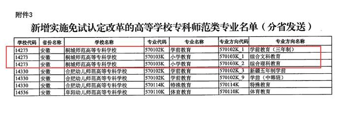 根據教育部辦公廳(教師廳函〔2022〕36號)文件內容,桐城師範高等專科學校學前教育(三年製)、小學教育(綜合文科教育)、小學教育(綜合理科教育)三個專業入選新增實施免試認定改革的高等學校專科師範類專業名單中。