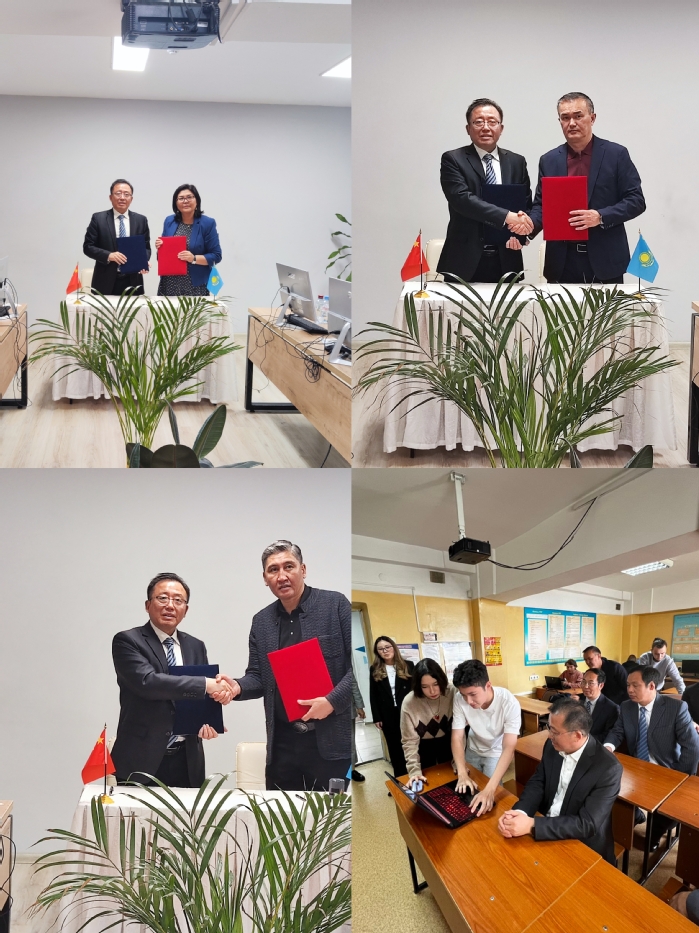 中哈是守望相助的好鄰居、相互信賴的好朋友、彼此成就的好夥伴。在哈薩克斯坦,王子龍一行訪問了中亞經濟技術學院,與中亞經濟技術學院院長努西普別科夫·耶爾詹·謝裏科維奇,阿拉木圖鐵道運輸技術學院院長卡利耶夫·阿爾馬斯·艾達爾別科維奇和圖蘭大學副校長阿利姆庫洛娃·紮娜·裏庫洛芙娜三所學校負責人共同座談交流。三所學校負責人分別介紹了各自學校的辦學情況和特色,就漢語國際教育、設立魯班工坊、推進教師互訪、學生交換學習等有關問題進行了商討,最後達成一致,校黨委書記王子龍代表我校分別與三所學校簽訂了《中國桐城師範高等專科學校與哈薩克斯坦中亞技術經濟學院合作備忘錄》《中國桐城師範高等專科學校與哈薩克斯坦阿拉木圖鐵道運輸技術學院合作備忘錄》《中國桐城師範高等專科學校與哈薩克斯坦圖蘭大學合作備忘錄》。