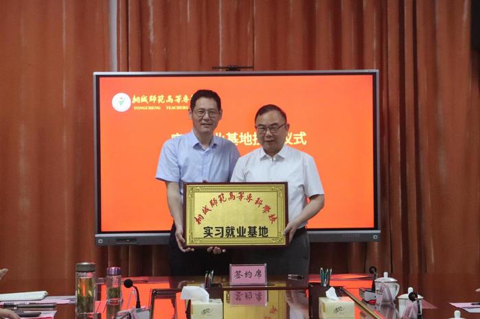 會上,學校與桐城國軒新能源有限公司簽署戰略合作協議,校長江貴生與桐城國軒新能源有限公司董事長江平共同完成“實習就業基地”授牌儀式。雙方圍繞人才培養、實訓場地建設、學生實習實踐等內容展開座談交流。