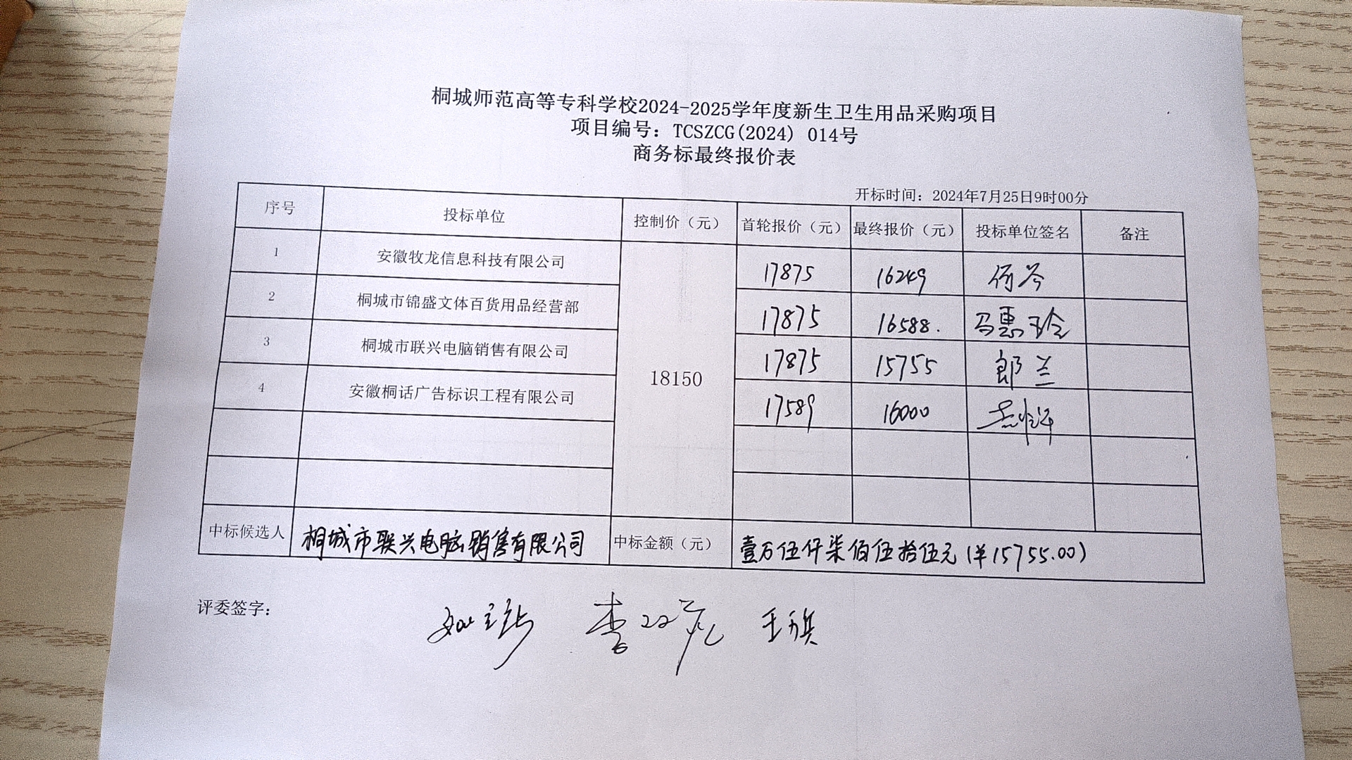 中標金額:人民幣壹萬伍仟柒佰伍拾伍元整(¥15755元)
