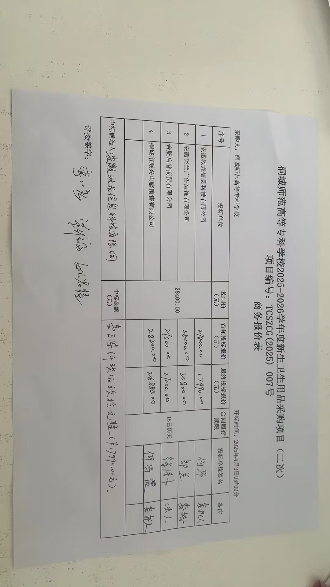 桐城師範高等專科學校2025-2026學年度新生衛生用品采購項目(二次)中標結果公示