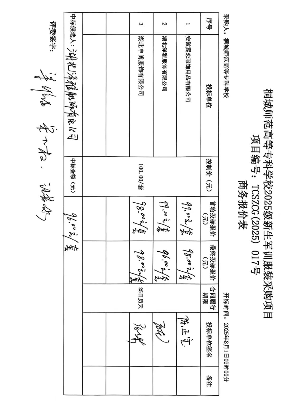 項目名稱:桐城師範高等專科學校2025級新生軍訓服裝采購項目 招標範圍:桐城師範高等專科學校2025級新生軍訓服裝采購項目 要求:符合談判文件要求 合同履行期限:25日曆天 產品標準:符合談判文件要求 |
