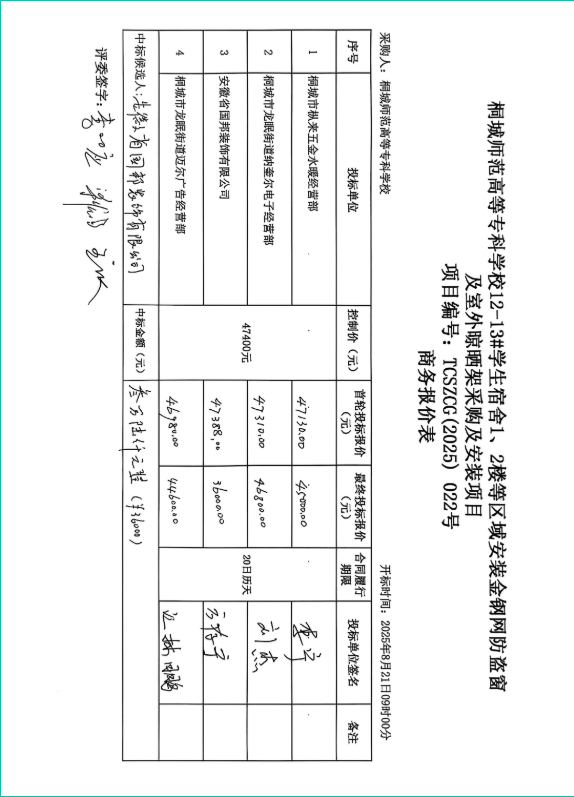 項目名稱:桐城師範高等專科學校12-13#學生宿舍1、2樓等區域安裝金鋼網防盜窗及室外晾曬架采購及安裝項目 招標範圍:桐城師範高等專科學校12-13#學生宿舍1、2樓等區域安裝金鋼網防盜窗及室外晾曬架采購及安裝項目 要求:符合談判文件要求 合同履行期限:20日曆天 產品標準:符合談判文件要求 |