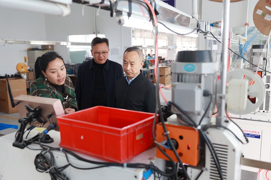 圖為汪名南(右)在嶽西經濟開發區某企業調研,了解相關部門服務企業情況。朱曉林 攝