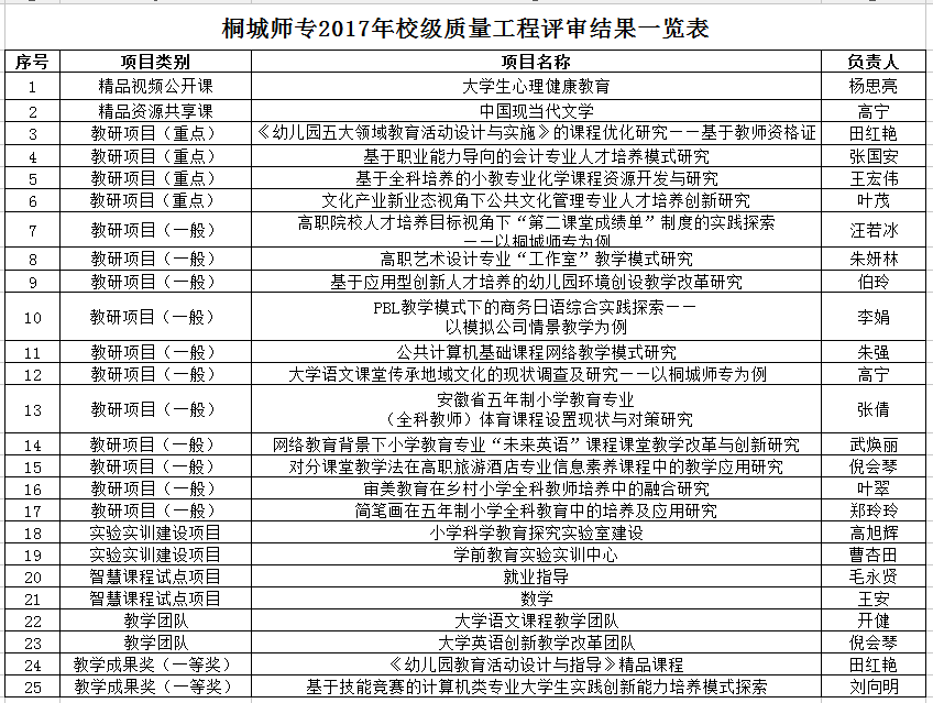 根據桐師專教務【2017】48號《關於做好2017年度高等學校省級質量工程暨我校2017年度校級質量工程申報工作的通知》文件精神,經個人申報、係(處)推薦、學校組織專家評審,擬推薦2017年校級質量工程項目已評選完畢,現予以公示(見附表)。公示期內,如有異議可向校監察審計處和教務處反映。