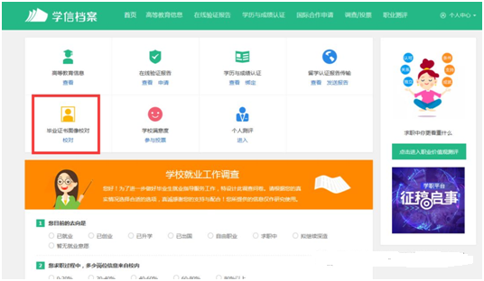 3.登錄後,在打開的頁麵中點擊“畢業證書圖像校對”,如下圖: