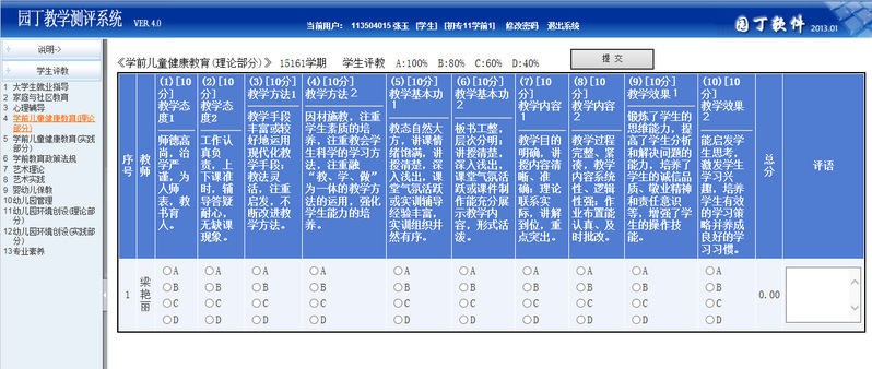 1、網上評教係統設計時保證每位學生的評教信息不被跟蹤(即評價的結果不體現評價學生個人信息),學生可以放心地對每一位任課教師進行客觀、公正地評價,但也不得惡意歪曲事實。學生需要對本學期所有授課教師進行逐一評價並單獨完成評教任務,不得請他人代評。
