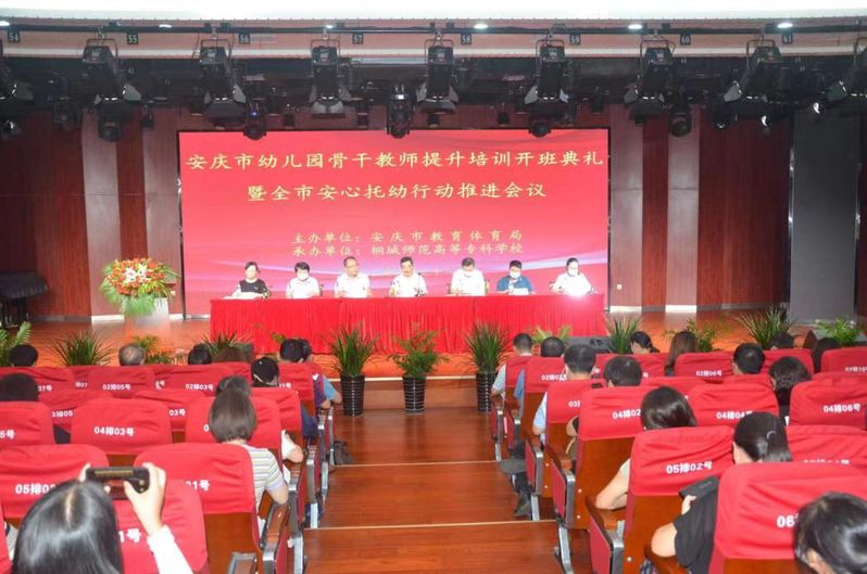 為貫徹全省、全市暖民心行動工作部署推進會精神,落實安徽省教育廳等5部門《關於做好幼兒園延時服務工作的通知》要求,結合我市幼兒教師隊伍建設的實際,8月21日,由安慶市教體局主辦,桐城師範高等專科學校承辦的2022年安慶市幼兒園骨幹教師提升培訓暨全市安心托幼行動推進會議在桐城師範高等專科學校演藝廳順利舉行。