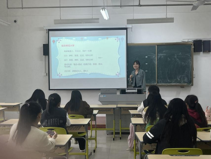 王麗從院校選擇開始講起,給同學們列出了“求穩”和“突破”兩個層次的院校,其中她重點介紹了安慶師範大學的考研情況,強調安慶師大考研難度小、不壓分、保護一誌願等對同學們有利的優勢。接下來介紹了小學教育專業考試科目“333”和“907”的考試題型以及複試的主要內容。隨後她分享了自己的考研經曆,學習方法以及學習之餘的放鬆方式。最後她鼓勵同學們要堅持到底,用強大的內心去戰勝一切,耐住寂寞,享受考研的整個過程。