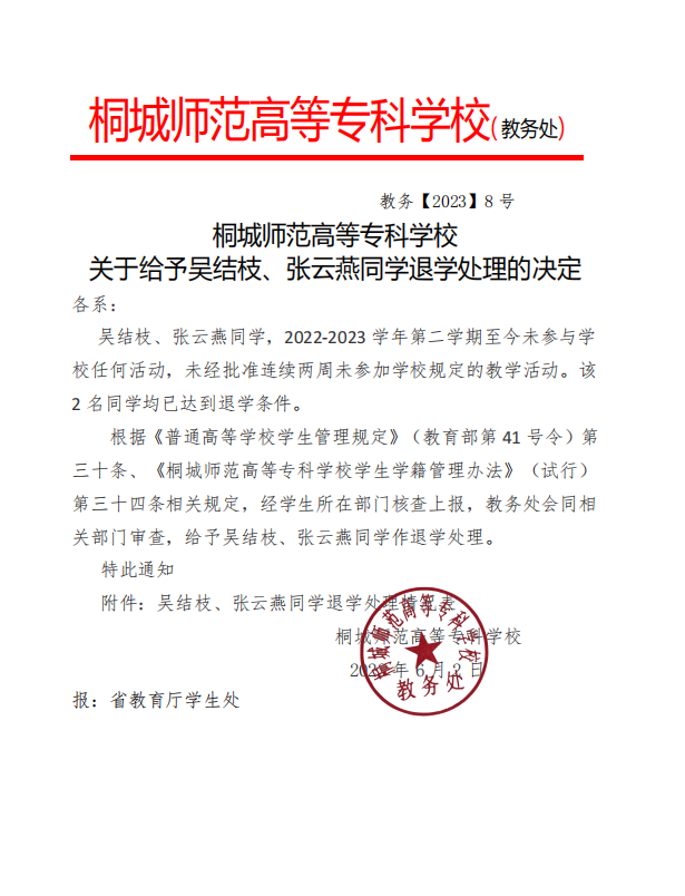 教務【2023】8號 桐城師範高等專科學校關於給予吳結枝等同學退學處理的決定.pdf