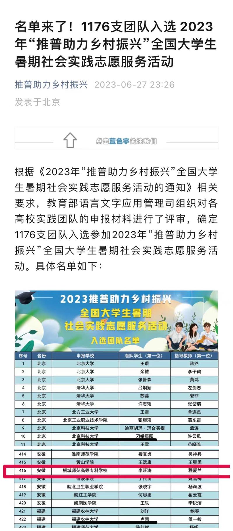 2023年6月27日,教育部發布《2023年“推普助力鄉村振興”全國大學生暑期社會實踐誌願服務活動入選團隊名單》,我校“走進美麗黔西,助力普通話推廣傳播”團隊成功入選。