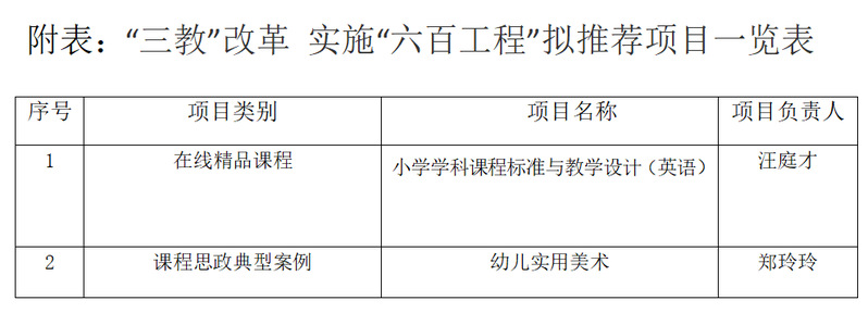 根據《《安徽省教育廳關於深化職業教育“三教”改革實施“六百工程”的通知》(皖教秘職成〔2024〕10號)文件要求,經個人申報、係部推薦、學校審議,“三教”改革“六百工程”項目項目已申報完畢,現予以公示(見附表)。公示期內,如有異議可向校監察審計處和教務處反映。