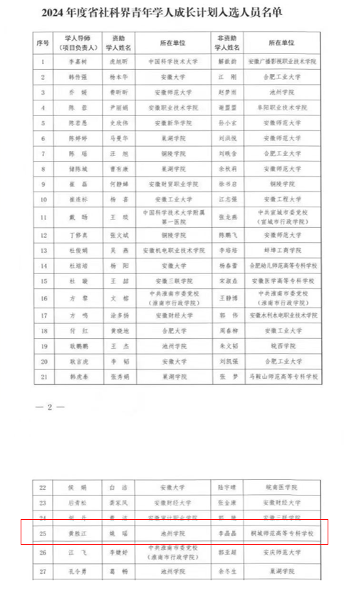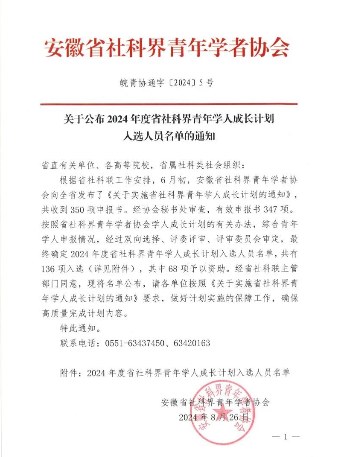 近日,安徽省社科界青年學者協會公布了“2024年度省社科界青年學人成長計劃”入選人員名單。根據省社科聯工作安排,6月初,安徽省社科界青年學者協會向全省發布了《關於實施省社科界青年學人成長計劃的通知》,省社科聯共收到350項申報書,有效申報書347項。經過評委評審、評審委員會審定、人選公示等程序,本年度共有136項入選,其中資助項目68項。我校李晶晶教師成功入選2024年度省社科界青年學人成長計劃。