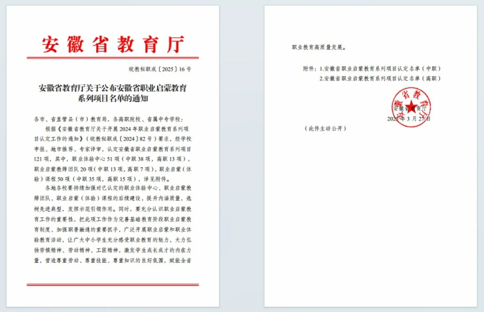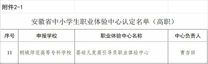 近日,安徽省教育廳公布了安徽省職業啟蒙教育係列項目的立項名單,桐城師專申報的嬰幼兒發展引導員職業體驗中心項目成功獲批。據悉,全省該類項目僅有13個,該項目是桐城師專獲批的首個省級實踐育人中心,這一成果實現了我校在實踐育人領域的重大突破,為學校的發展增添了濃墨重彩的一筆。