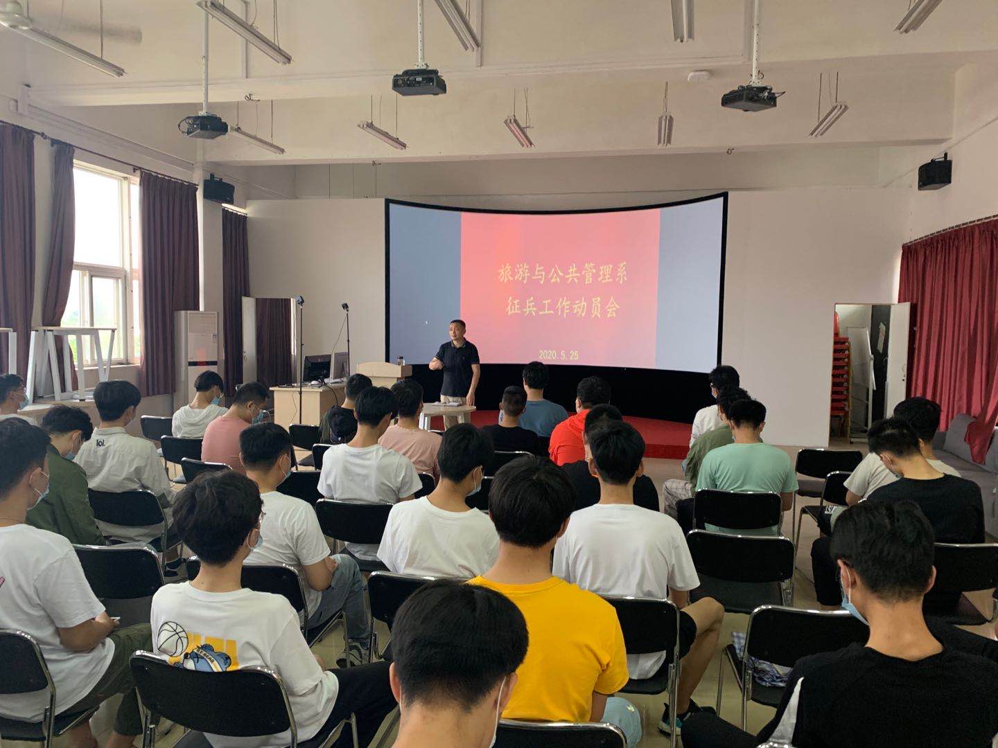 5月25日下午午,旅遊與公共管理係召開大學生應征入伍動員會。葉茂同誌主持會議,旅管係77名男生參加了動員會。會上,葉茂同誌首先對近幾年來旅管係征兵情況作了介紹,作為教師教育專業為主的師範專科學校女生占比大,但是每年都有很多男生踴躍報名參軍,在部隊這個大熔爐裏鍛造,在部隊這個大學繼續學習,全方位提升現代青年人的綜合素養;接著根據學校關於征兵工作的部署要求以及今年國家對大學生應征入伍的政策和條件作了解讀,傳達了學校征兵工作會議精神。他說,優秀大學生參軍入伍是學校國防教育、愛國主義教育的一項重要內容,今年疫情防控和征兵入伍兩不誤,防疫背景下,學校優化宣傳方式,運用好網絡平台開辟線上線下答疑通道。一方麵,學校很早就啟動了2020年大學生征兵工作,大幅提升了參軍入伍學生的政策支持力度,為今年征兵工作的開展提供了強有力的保障。確保學校參軍優惠政策宣傳到位、落實到位、服務到位,讓每位學生“入伍安心,服役暖心,退伍放心”。另一方麵,大家要認識到高校大學生到部隊服役也是大家成長成才的重要途徑,投身軍營,樹立強國強軍的責任擔當,把愛國之心化為報國之行。隨後,他就本係兩名退伍複學的同學在學校學習生活方麵展現的良好的組織性和紀律性以及學校給予他們的政策優待進行了現場版案例分析。