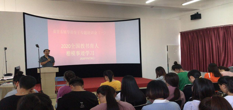 先,汪庭才就啟動學工隊伍“青藍工程”、開展專題培訓學習的重要性和必要性做了闡述,他指出,新形勢下,學工隊伍更新換屆加快,實施“青藍工程”、完善輔導員和學團幹部“傳幫帶”以老帶新機製,通過集中專題培訓學習和自主研修,學校和係部旨在盡快提升輔導員政治覺悟和職業素養、培養鍛煉學生幹部業務能力和工作執行力。培訓學習的內容要涵蓋師德師風、意識形態安全教育的思政主題也要包括提升學工隊伍服務與管理方麵的職業技能,要請專家和行家裏手來講課、要常態化要注重實效。隨後他指出第一期專題培訓選擇在第36個教師節來臨時開始,意義重大,大家學習12位2020全國教書育人楷模事跡,不僅自己要認真感悟體驗並要在班級主題班會上向廣大大學生宣講楷模們那種愛崗敬業、無私奉獻的高尚品質,對工作一絲不苟高度負責的敬業精神和樂於助人甘當人梯的職業道德。