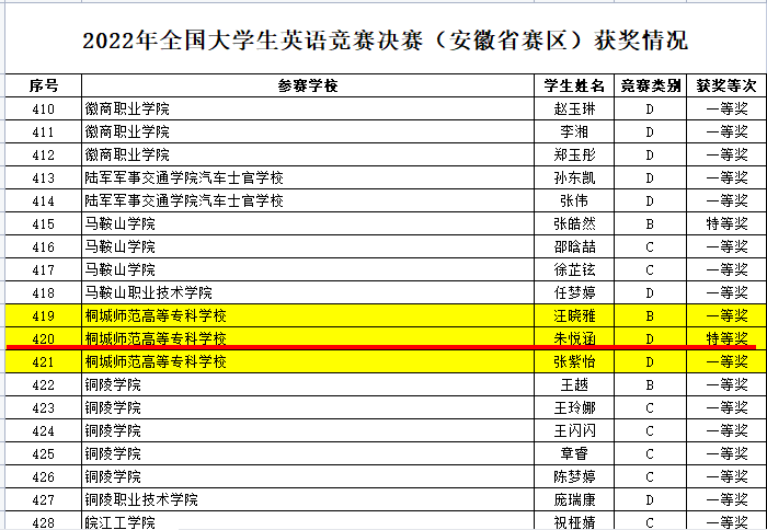 10月23日落幕的2022年全國大學生英語競賽(安徽賽區)決賽中,我校3名學子在指導教師的悉心輔導下喜獲佳績,其中1榮獲全國大學生英語競賽總決賽D等獎,2人分別榮獲全國大學生英語競賽總決賽B類、D類一等獎,是曆年來取得的最好成績。