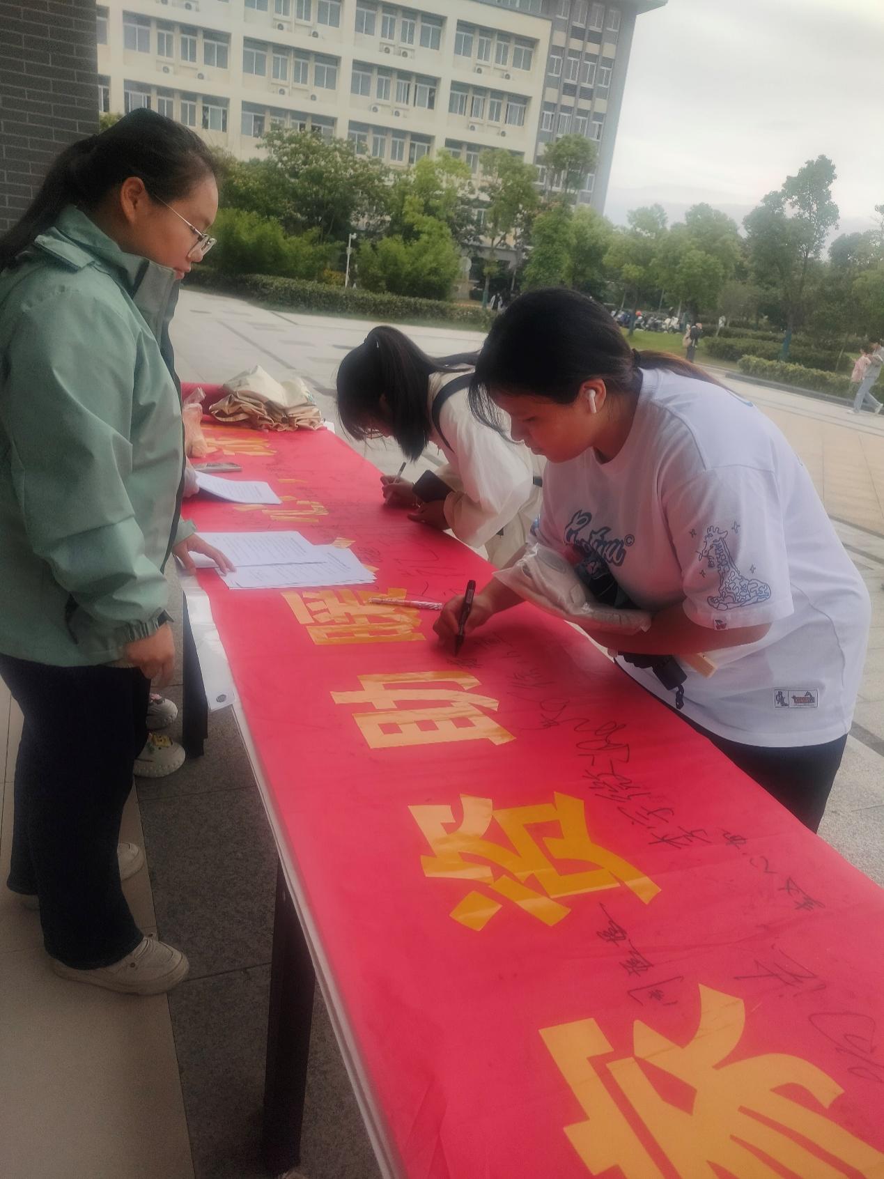 活動現場,同學們在了解了資助知識、意識到資助誠信的重要性後,紛紛在橫幅上、在承諾書上簽名,以示對此活動的支持和對誠信的承諾。同學們紛紛表示,會時刻嚴格要求自己,樹立誠信個人形象,堅持誠信處事原則,端正誠信求知態度,遵循誠信信貸準則,做一個誠實守信的新時代青年大學生。